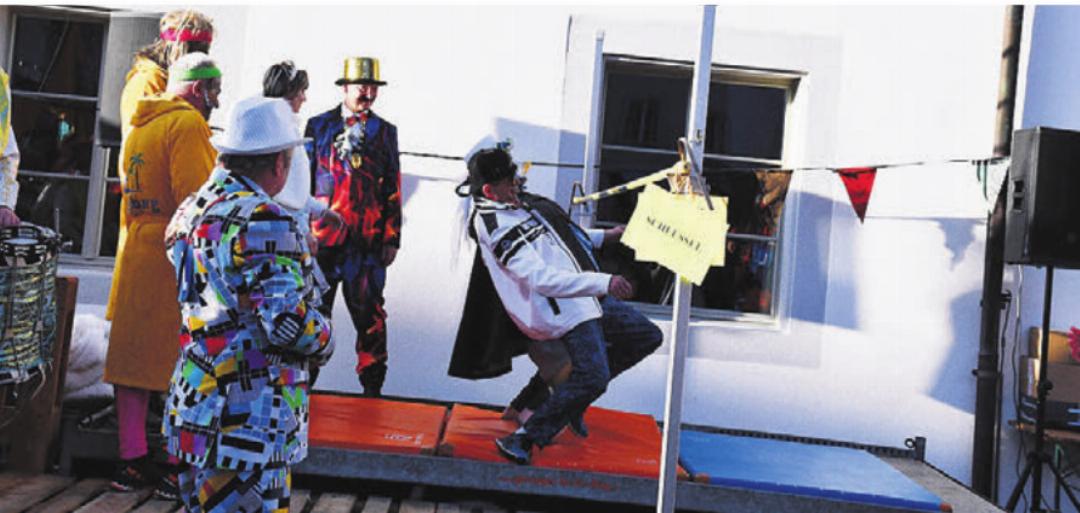 In ihrer Präsentation erweisen sich die Lehrlinge als Profis. Jörg Weiss erklärt in Reimform, dass es nach fünf Wochen Strapazen nun endlich Zeit sei, sich etwas zu erholen, und so übergeben sie die Macht gerne an die Städte. Doch zuerst lud er die Schultheissinnen und Schultheisse zum Limbo-Tanz ein. Er gab seiner Hoffnung Ausdruck, dass sie fit für ihr Amt und sicherlich noch nüchtern seien. Die erste Hürdenhöhe hiess «halber Schlüssel». «Dann zerbrechen wir sie halt, wenn ihr das nicht schafft», erklärt er trocken. Und fügt hinzu, dass je tiefer sie kommen, um so weniger Beton benötige die Gemeinde bei der Baustelle an der SBB-Unterführung der Zürcherstrasse. Mit erstaunlichen Methoden, jedoch recht souverän, schaffen die Schultheissinnen und Schultheisse die beiden Höhen. Doch das Publikum fordert mehr. Worauf sich Weiss zu einer Prognose bezüglich Stangenhöhe hinreissen lässt und verkündet: «Dies wird auch der künftige Steuerfuss der Gemeinde werden.» Zwar ist nicht ganz klar, warum sich die Gemeinde so freut. Denn wer genau hinsieht, hätte erkannt, dass 120 Zentimeter angezeigt werden. Wenig überraschend schaffen die fitten Führungskräfte auch die vom Publikum geforderte Höhe und erhalten ihre Schlüssel ausgehändigt. Ausgelassen feiern die wieder eingesetzten Magistraten ihre Macht mit den vielen Besuchern. Dies unterstützt durch die Melodien von «Blächreiz», den Adelburger Tambouren und den beiden lokalen Guggenmusiken.