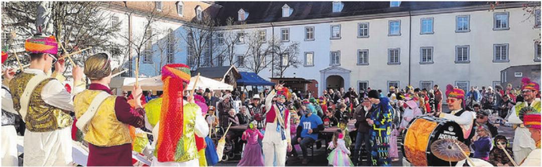 Pünktlich an diesem herrlichen Samstagnachmittag bevölkern bunt gekleidete und überglückliche Kinder und ihre Eltern den Klosterhof. Sie bringen sackweise Konfettis mit und eine Mini-Konfetti-Kanone trägt zur Freude aller bei. Wie es in Muri üblich ist, kommt man fantasievoll verkleidet und geschminkt. Die Kinder tollen herum und die Erwachsenen unterhalten sich in Gruppen und flanieren über den Platz.