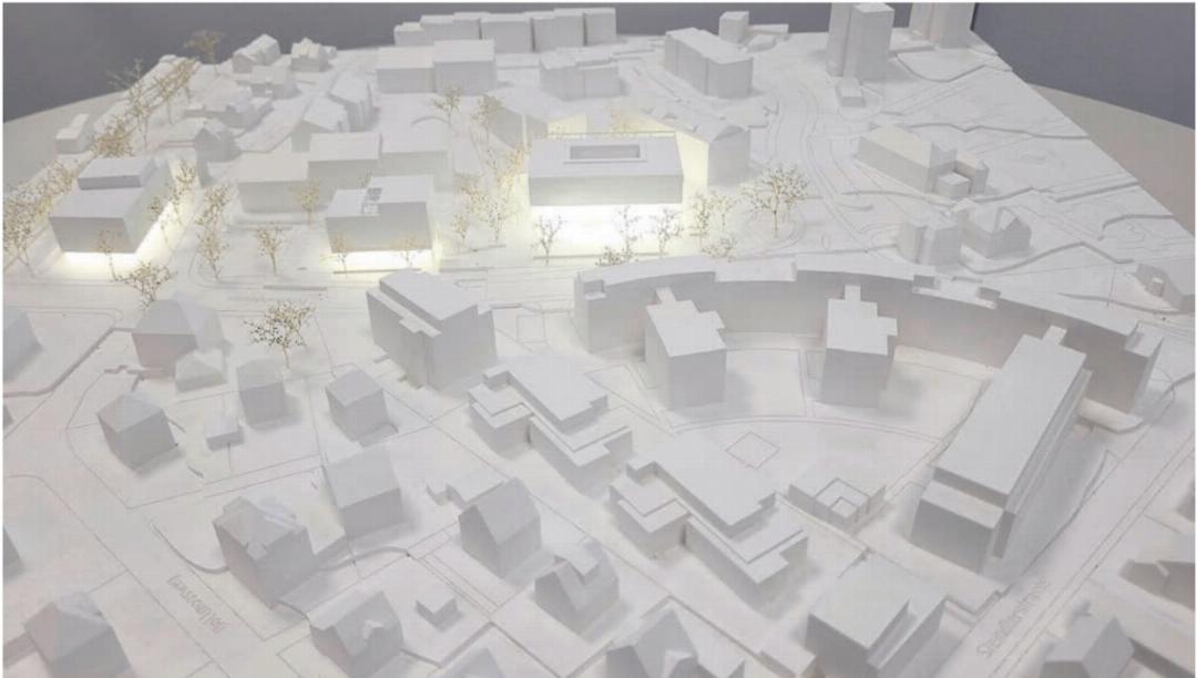 Das Projekt passt sich gut in die bestehende Umgebung ein. Das wird beim Blick auf das Modell besonders deutlich, dieses ist derzeit im Foyer des Gemeindehauses ausgestellt. Während das kleinere Gebäude sich an der Höhe der Nachbargebäude orientiert, übernimmt der zweite Bau die Höhe des bestehenden Bankgebäudes. Gemeinsam bilden die drei Bauten eine Einheit entlang der Friedhofstrasse und schaffen so eine Fortsetzung des Zentrums.