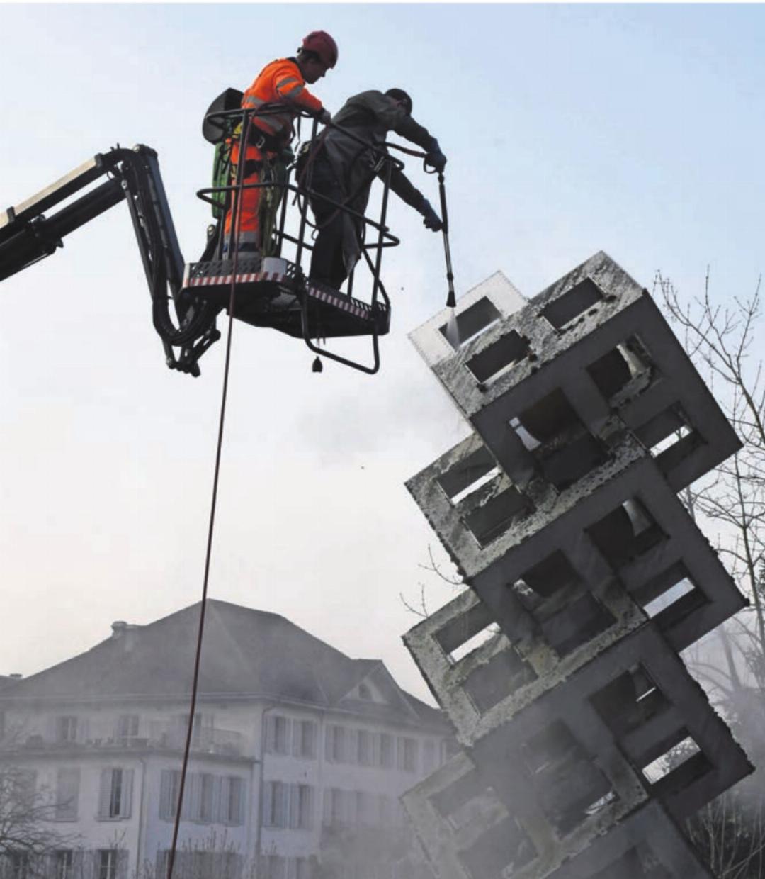 Das sagte er vor zweieinhalb Monaten. Und nun wurde diese Ankündigung auch umgesetzt. Und wie. Der gesamte Gemeinderat versammelte sich gestern Montagmorgen, 8 Uhr, vor dem Gemeindehaus. Mitarbeiter des Werkhofes unterstützten die fünf, und dann ging es an die Arbeit. Gemeinderat Olivier Parvex, wohl der Mutigste der Regierung, wurde in die Lüfte gehoben. Und bestens ausgerüstet machte er sich sprichwörtlich mit viel Hochdruck an die Arbeit. Die Brunnenplastik wurde Meter für Meter abgespritzt.