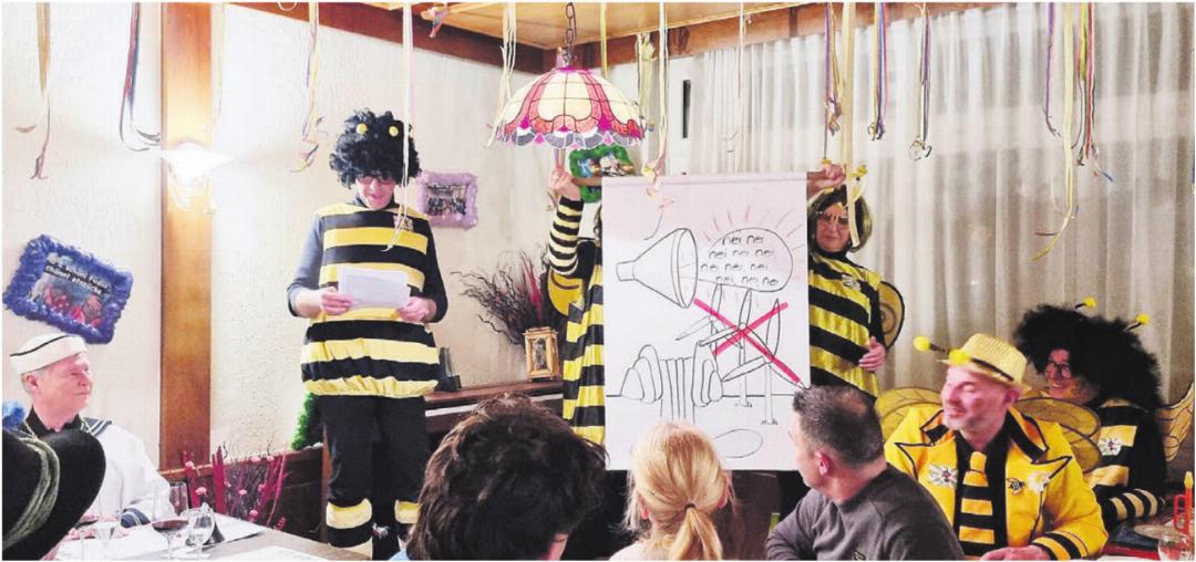 Während dieser Fasnacht sind die Beinwiler Hexen als Bienen unterwegs. Fleissig wie diese sind sie ausgeschwärmt und haben gesammelt, was im Dorf passiert. Sie haben die Gemeinde aber auch fasnächtlich bewegt. Eine Kostprobe davon zeigen sie als Tanzeinlage den gutgelaunten Besuchern des ausgelassenen Abends. «Wir haben gute Laune überall», singen sie lautstark und überzeugend mit dem ganzen Saal. Die Stimmung ist ausgelassen und fröhlich, als die drei Schnitzelbänke mit ihren Produktionen punkten. Kilian Rosenberg gilt als Geheimtipp. Er erweist sich als gut informierte Drohne.