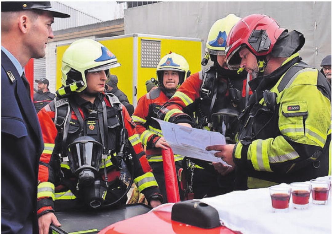 Tritt ein Kommandant zurück, so darf bei der Hauptübung am Ende des Feuerwehrjahres immer mit Überraschungen gerechnet werden. Das war am letzten Samstag in Widen ebenfalls der Fall. Publikum und Mannschaft harrten auf dem Sika-Areal bereits der Dinge, die da kommen sollten, als Kommandant und Einsatzleiter Patrick Koller im Ölwehrfahrzeug der Stützpunktfeuerwehr Baden auf dem Brandplatz eintraf. Kaum hatte er sich einen Überblick verschafft und das erste Einsatzfahrzeug neben der Lagerhalle, aus der Rauch austrat, platziert, brauste der Personentransporter aus dem Jahr 1961 der Feuerwehr Rudolfstetten-Friedlisberg heran. Vier Männer stiegen aus, gekleidet in Uniformen, wie sie die Inspektoren der Aargauer Gebäudeversicherung einst trugen. Auf der Motorhaube breiteten sie ein Tuch aus, stellten Gläser drauf und füllten sie mit einem feinen Likör.