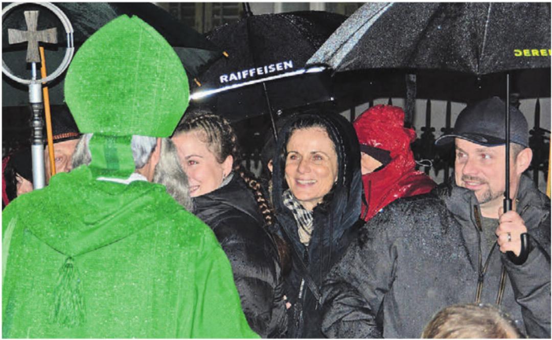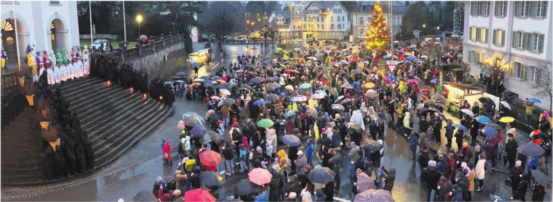 Der Samichlaus besucht die Menschen bei jedem Wetter. Am Chlausauszug verteilt er 120 kg Erdnüsse, 80 kg Mandarinen und 40 kg Lindor-Kugeln und sorgt so für viel Freude und Helligkeit im tristen Wetter.