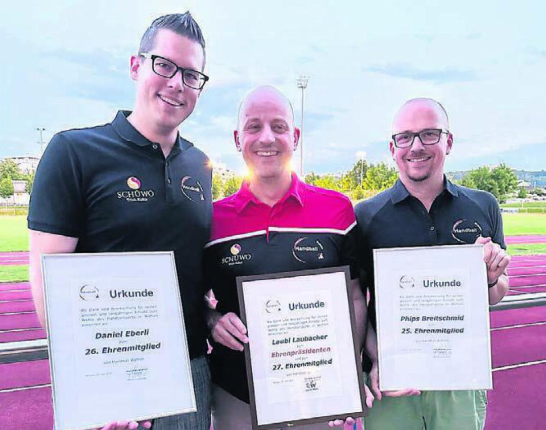 Dazu gab es zwei neue Ehrenmitglieder zu feiern: Daniel Eberli und Phibs Breitschmid. Eberli ist der Einzige im Vorstand, der noch länger dabei war als Laubacher. Seit 17 Jahren ist der gebürtige Niederwiler und frühere Rückraumturm im Vorstand. Eberli machte in diesen Jahren vieles. Den Spielbetrieb leitete er phasenweise aus Kuala Lumpur (wo er beruflich tätig war). Zuletzt war er auch Vizepräsident. Phibs Breitschmid hat im Verein ebenfalls schon viele Ämter ausgeübt. Anlässe, Beizli, Speaker – mit viel Herzblut und Einsatz hat Breitschmid über 10 Jahre hinweg Grosses geleistet.